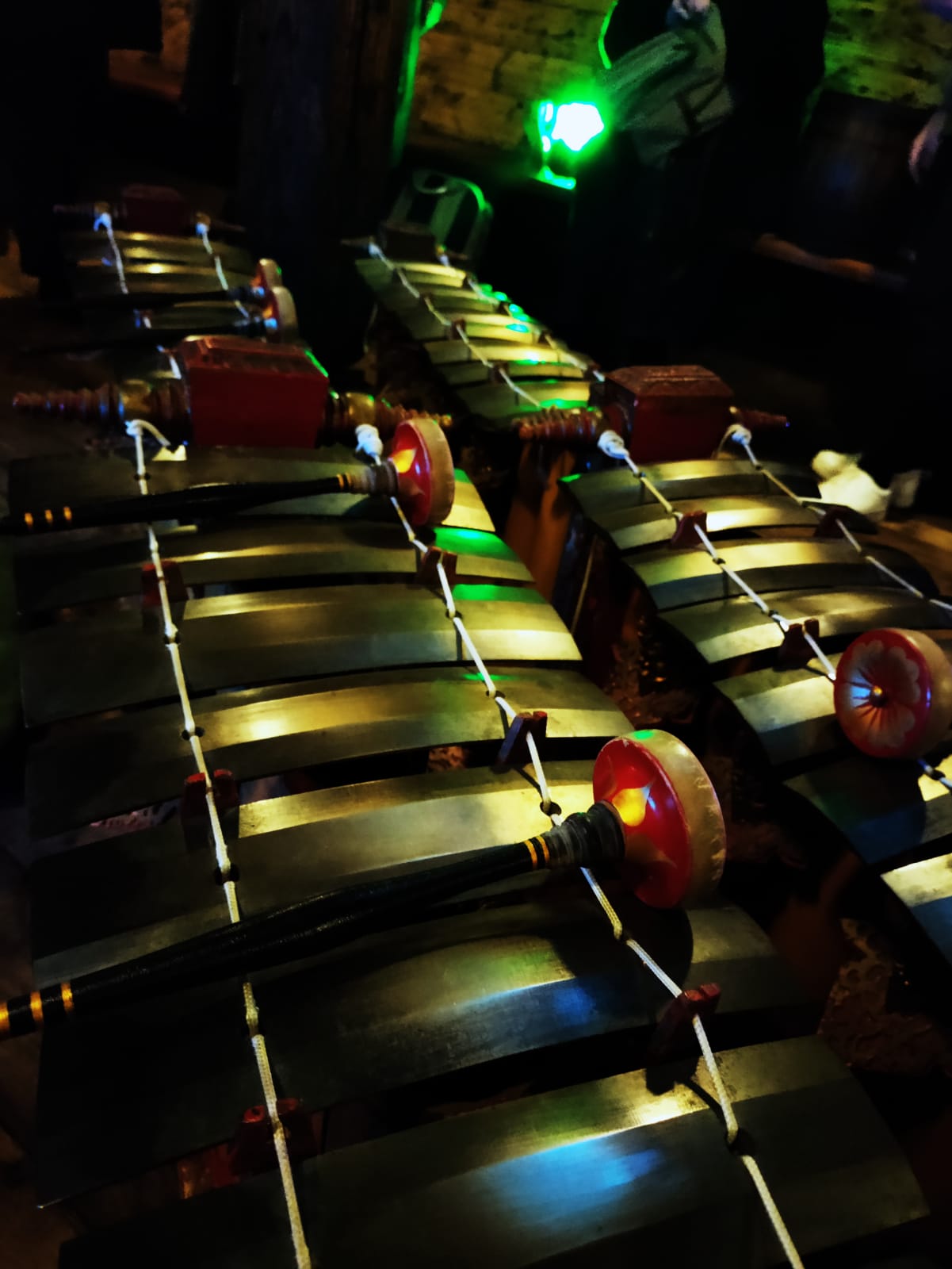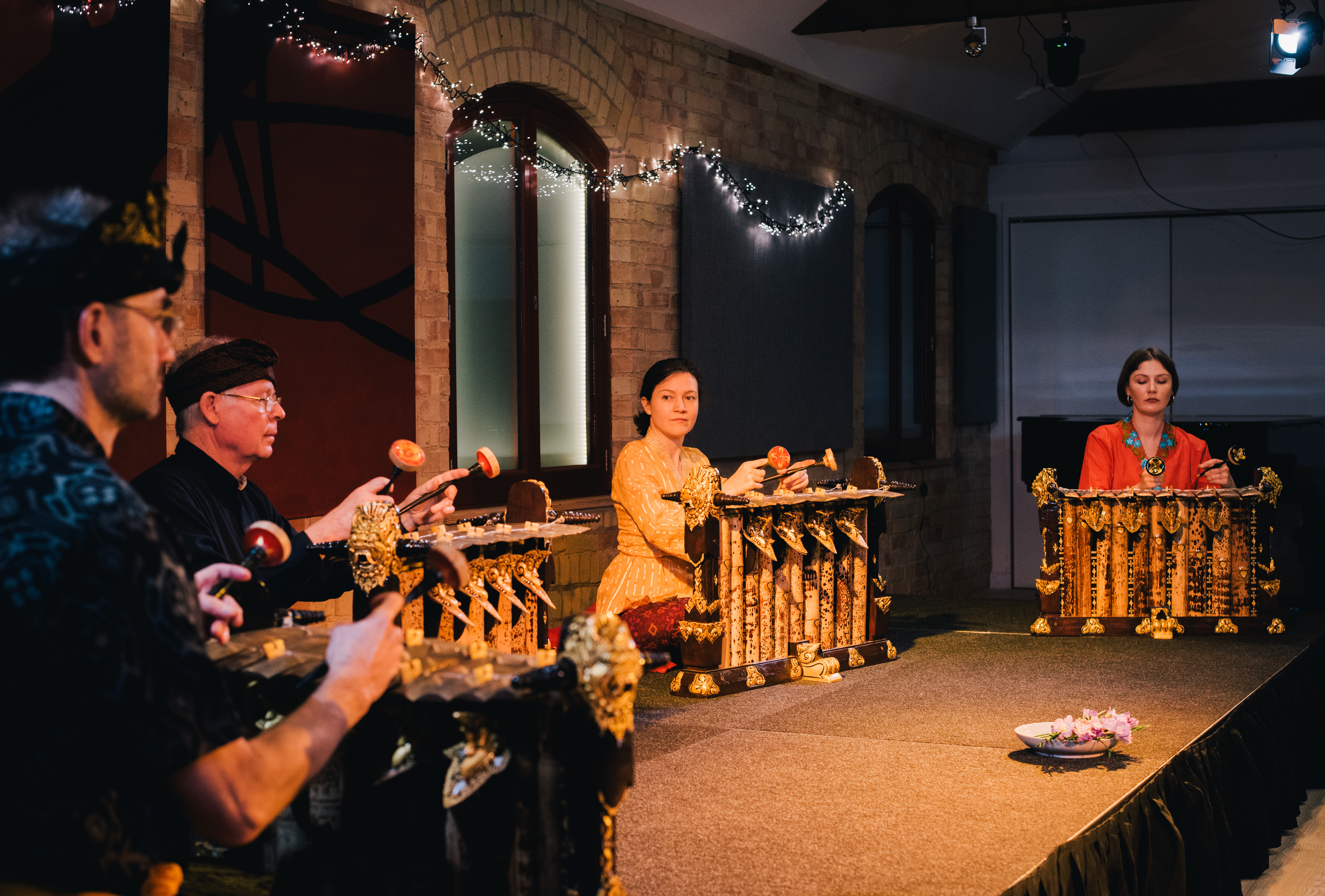 The playing technique in this miniature gamelan ensemble is very demanding, as player must damp the ringing notes with their wrists while executing high-speed figuration that interlocks between the instruments. Bamboo resonating tubes beneath the keys give the sound a unique resonance.